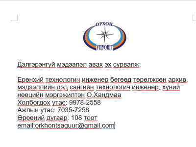 Дэлгэрэнгүй мэдээлэл авах эх сурвалж: Ерөнхий технологич инженер бөгөөд төрөлжсөн архив, мэдээллийн дэд сангийн технологич инженер, хүний нөөцийн мэргэжилтэн О.Хандмаа Холбогдох утас: 9978-2558 Ажлын утас: 7035-7258 Өрөөний дугаар: 108 тоот email:orkhontsaguur@gmail.com