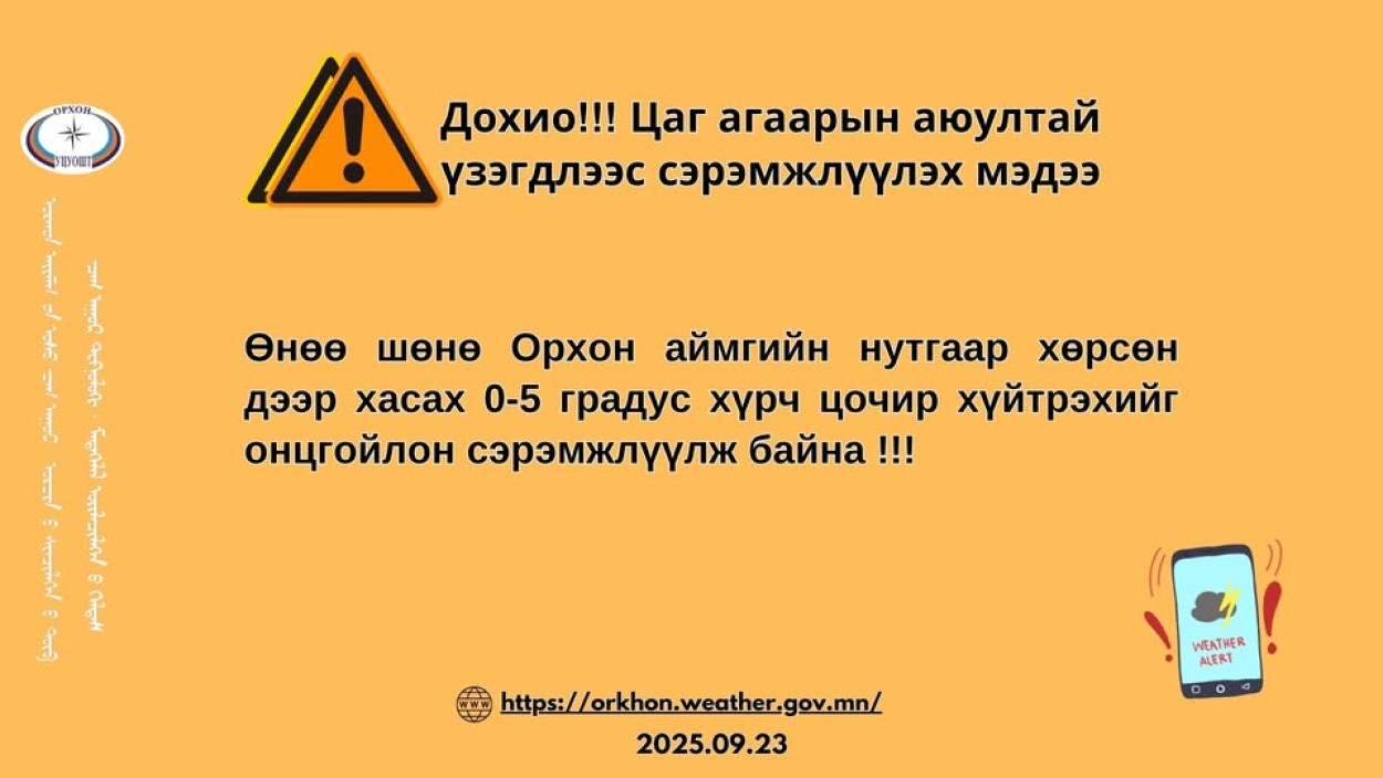 Өнөө шөнө хөрсний хэм -2...+3 градус хүрч цочир хүйтрэх тул нарийн ногоо болон ил хураасан төмс хайрагдах зэрэг учирч болзошгүй эрсдлээс сэргийлнэ үү!!!