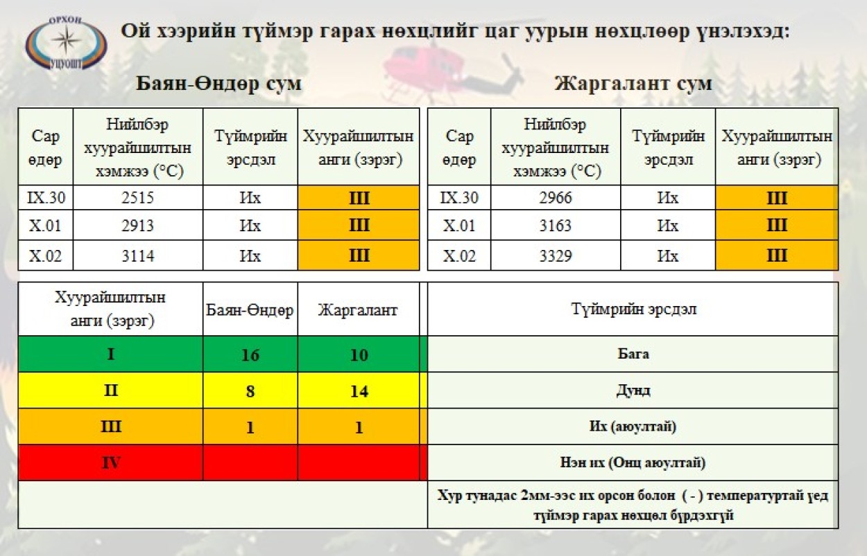 Өнөөдрийн байдлаар хуурайшилтын зэрэг III буюу түймэр гарах эрсдэл ихтэй байгааг онцгойлон анхааруулж байна!