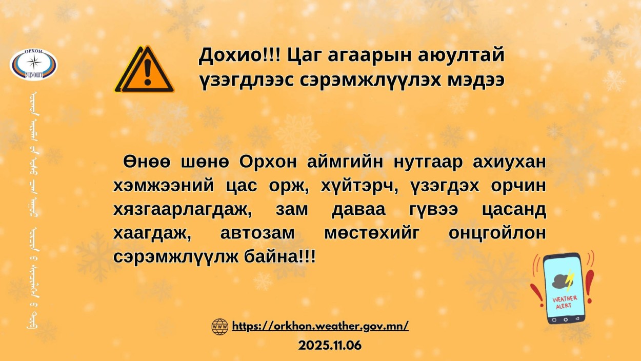 Өнөө шөнө Орхон аймгийн нутгаар ахиухан хэмжээний цас орж, хүйтэрч, үзэгдэх орчин хязгаарлагдаж, зам даваа гүвээ цасанд хаагдаж, автозам мөстөхийг онцгойлон сэрэмжлүүлж байна!!!