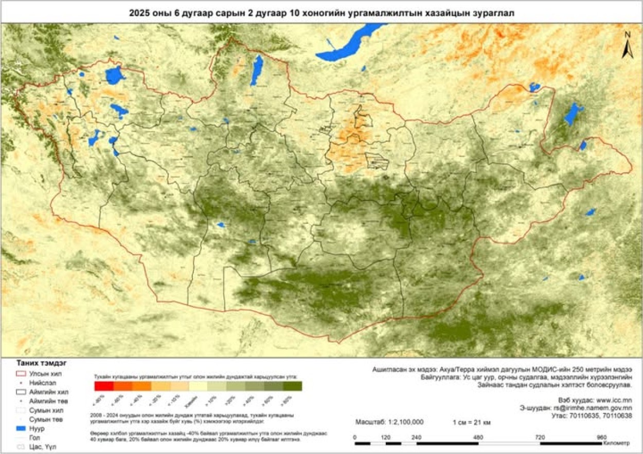 Хиймэл дагуулын мэдээнд тулгуурлан Монгол орны бэлчээрийн өнөөгийн байдлыг олон жилийн дундаж бэлчээрийн нөхцөлтэй харьцуулан харуулж байна.