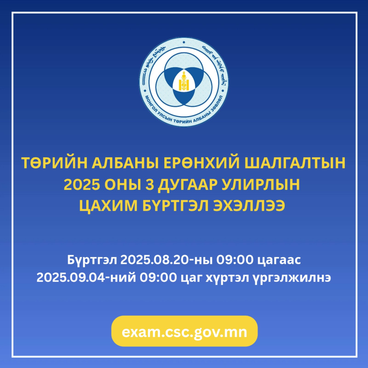 Төрийн албаны 2025 оны 3 дугаар улирлын ерөнхий шалгалтын цахим бүртгэл 8 дугаар сарын 20-ны өдрийн 09:00 цагаас 9 дүгээр сарын 04-ний өдрийн 09:00 цаг хүртэл Төрийн албаны зөвлөлийн https://exam.csc.gov.mn/ цахим хуудсаар явагдана.