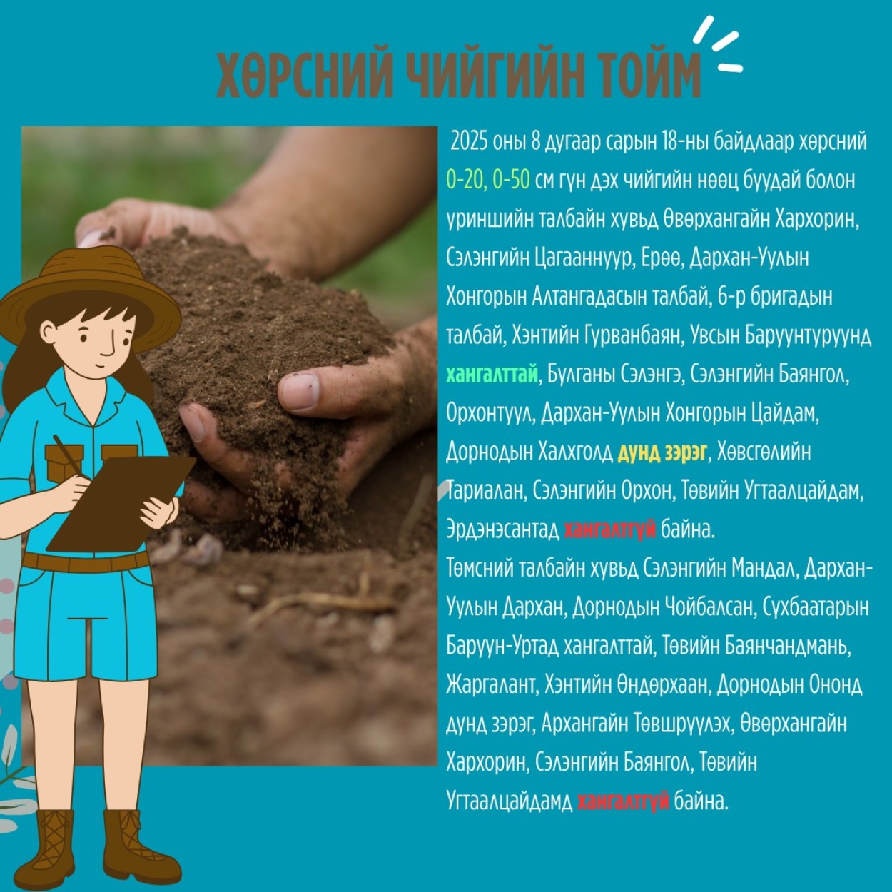 2025.08.18-ны байдлаар хөрсний 0-20, 0-50 см гүн дэх чийгийн нөөц буудай болон уриншийн талбайд хэр байгаа талаар үнэлэн, аймаг сумдаар хангалттай, хангалтгүй, дунд зэрэг гэж тоймлов.