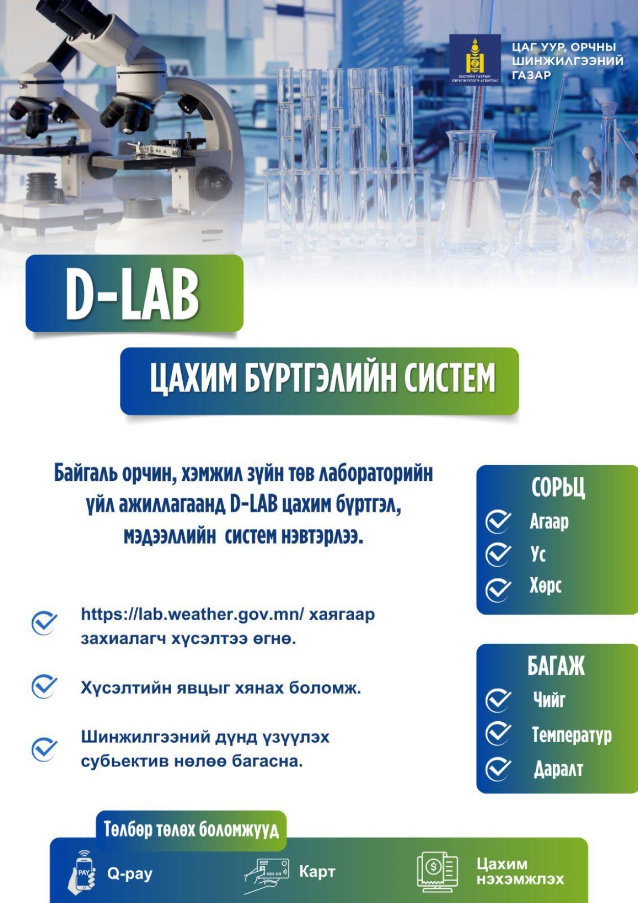 Цаг уур, орчны шинжилгээний газрын харьяа Байгаль орчин, хэмжил зүйн төв лаборатори үйл ажиллагаандаа D-LAB цахим бүртгэл, мэдээллийн системийг нэвтрүүллээ. Агаар, ус, хөрсний чанарын шинжилгээ хийлгэх, багаж шалгуулах, баталгаажуулах иргэн, аж ахуйн нэгж байгууллагын тоо жилээс жилд нэмэгдэж байгаа энэ үед төрийн үйлчилгээний чанар хүртээмжийг сайжруулахад дэвшил гарч байна.