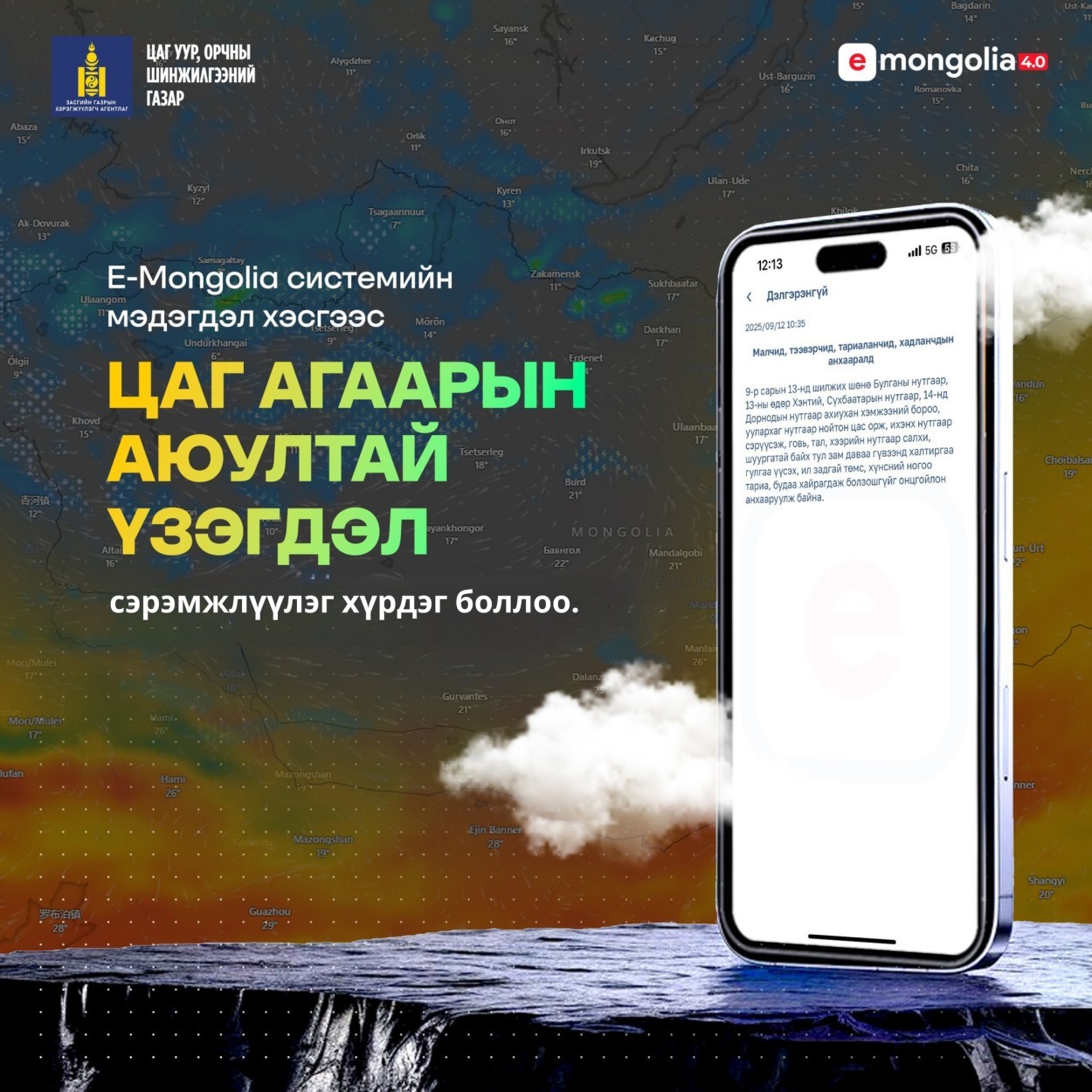 Цаг уур, орчны шинжилгээний газар, “И-Монгол академи” хамтран аппликейшний мэдэгдэл хүргэх системээр цаг агаарын аюултай болон гамшигт үзэгдлийн мэдээллийг шуурхай хүргэж эхэллээ.