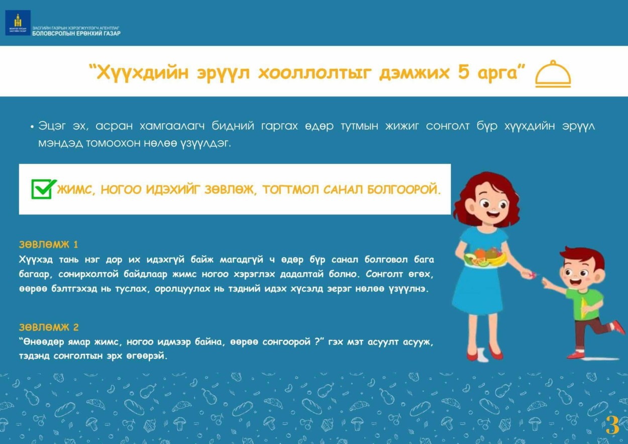 Эрүүл хоол хүнс, биеийн идэвхтэй дасгал хөдөлгөөнийг өдөр тутмын хэвшмэл үйл ажиллагаа болгон заншуулах нь хүүхдийн хөгжил, эрүүл мэндийг дэмжихээс гадна эерэг, эрүүл сонголтыг хийх насан туршийн чадварыг төлөвшүүлэхэд тусалдаг.