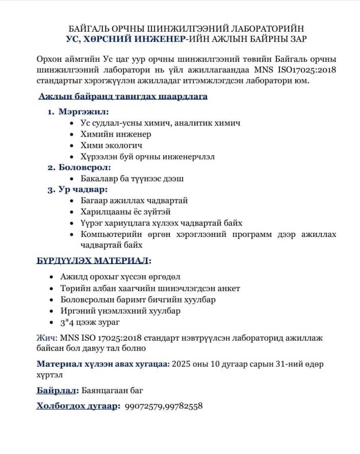 Жич: MNS ISO 17025:2018 стандарт нэвтрүүлсэн лабораторид ажиллаж байсан бол давуу тал болно