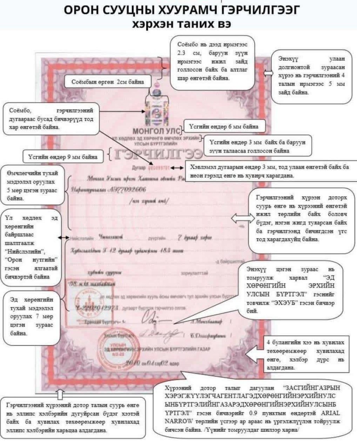 Улсын бүртгэлийн ерөнхий газраас олгодог Үл хөдлөх эд хөрөнгийн гэрчилгээний стандардтай доорх зургаас танилцаарай.