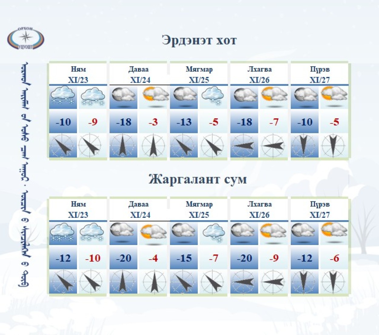 22-оос 23-нд шилжих шөнөдөө, 23-нд цас орно, 25-нд ялимгүй цас орно. Бусад хугацаанд цас орохгүй. Салхи ихэнх хугацаанд 4-9 м/с. Цас орох үеэр салхи үе үе ширүүснэ. Шөнөдөө -20...-15°С, өдөртөө -9...-4°С хүйтэн байна.