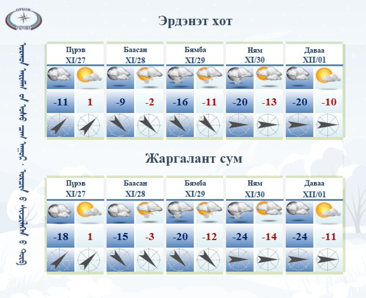 2025 оны 11 сарын 27-оос 12 сарын 02-ыг хүртэлх 5 хоногийн урьдчилсан мэдээ:
