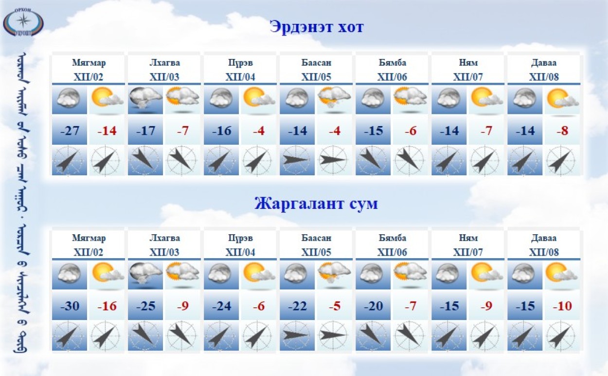 Хүйтний эрч чангарч шөнөдөө Баян-Өндөр ормоор 22-27°С, Жаргалант орчмоор 25-30°С хүйтэн, өдөртөө нийт нутгаар 10-15°С хүйтэн. 12 сарын 03-аас хүйтний эрч бага зэрэг суларч шөнөдөө Эрдэнэт орчмоор 15-20°С, Жаргалант орчмоор 20-25°С хүйтэн, өдөртөө нийт нутгаар 4-9°С хүйтэн байна.