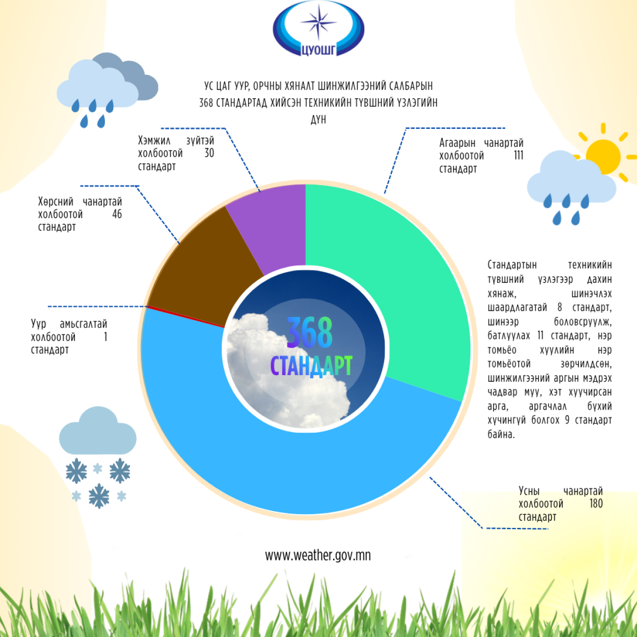 Монгол Улсын Засгийн газрын 2024-2028 оны үйл ажиллагааны хөтөлбөрийн 3.4.3.1-д "Стандарттай байгаль орчны салбар" хөтөлбөрийг хэрэгжүүлнэ.”, 4.4.4.13-т “Нэг улс, нэгдсэн стандарт хөтөлбөрийг хэрэгжүүлнэ.” гэж тус тус заасан. Цаг уур, орчны шинжилгээний газрын даргын 2025 оны А/145 дугаар тушаалаар байгуулагдсан Ажлын хэсэг ус цаг уур, орчны хяналт шинжилгээний салбарын стандартуудад техникийн түвшний үзлэгийг 4 сарын хугацаанд хийж гүйцэтгэв. Ус цаг уур, орчны хяналт шинжилгээний салбарт Монгол Улсын Үндэсний MNS стандарт 189, олон улсын ISO стандарт буюу 1:1 орчуулж, шууд ашиглаж байгаа стандарт 179 нийт 368 стандарт мөрдөгдөж байна. Стандартуудыг ангилбал уур амьсгалтай холбоотой 1 стандарт, агаарын чанартай холбоотой 111 стандарт, усны чанартай холбоотой 180 стандарт, хөрсний чанартай холбоотой 46 стандарт, хэмжил зүйтэй холбоотой 30 стандарт хүчин төгөлдөр мөрдөгдөж байна. Стандартын техникийн түвшний үзлэгээр дахин хянаж, шинэчлэх шаардлагатай 8 стандарт, шинээр боловсруулж, батлуулах 11 стандарт, нэр томьёо хуулийн нэр томьёотой зөрчилдсөн, шинжилгээний аргын мэдрэх чадвар муу, хэт хуучирсан арга, аргачлал бүхий хүчингүй болгох 9 стандарт байна. Үзлэгийн мөрөөр байгаль орчны стандартуудыг сайжруулах, шинээр боловсруулах, стандартыг ойлгох, дагаж мөрдөх талаар олон нийтийн зөв хандлагыг төлөвшүүлэх, стандартын хяналтыг боловсронгуй болгох, шинэ дэвшилтэт технологи, инновацыг шингээсэн олон улсын түвшинд хүрсэн стандартыг боловсруулж нэвтрүүлэх, хэрэгжүүлэх, хүн амын эрүүл, аюулгүй орчинд амьдрах нөхцөлийг хангахад шаардлагатай стандартуудыг шинээр боловсруулах, шинэчлэх ажил ийнхүү эхэллээ.