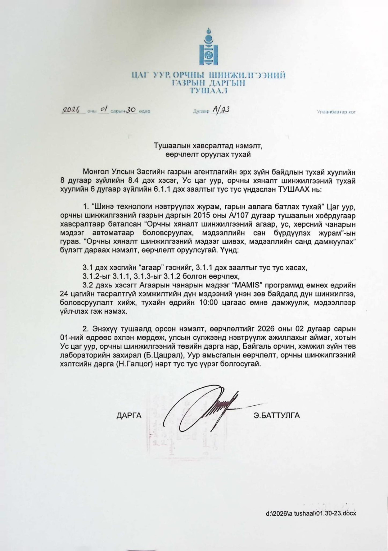 2. Энэхүү тушаалд орсон нэмэлт, өөрчлөлтийг 2026 оны 02 дугаар сарын 01-ний өдрөөс эхлэн мөрдөж, улсын сүлжээнд нэвтрүүлж ажиллахыг аймаг, хотын Ус цаг уур, орчны шинжилгээний төвийн дарга нар, Байгаль орчин, хэмжил зүйн төв лабораторийн захирал (Б.Цацрал), Уур амьсгалын өөрчлөлт, орчны шинжилгээний хэлтсийн дарга (Н.Галцог) нарт тус тус үүрэг болгосугай.