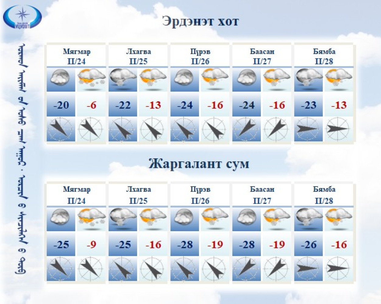 24-нд нийт нутгаар өдөртөө хүйтний эрч суларч -11...-6°.
