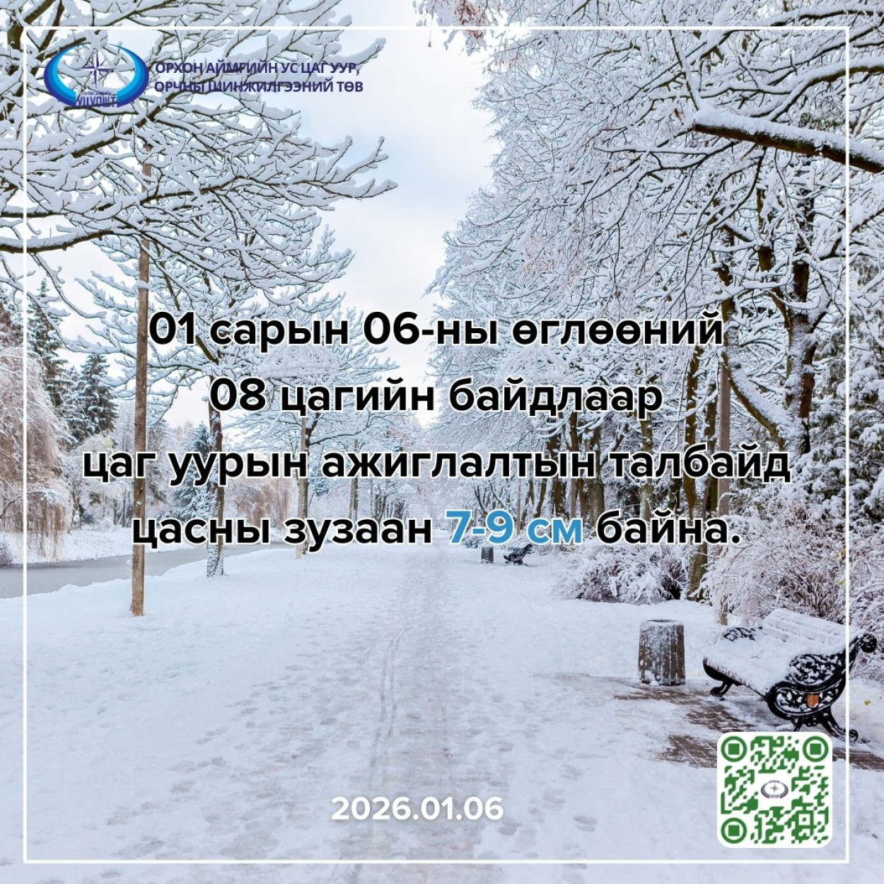 01 сарын 06-ны өглөөний 08 цагийн байдлаар цаг уурын ажиглалтын талбайд цасны зузаан 7-9 см байна