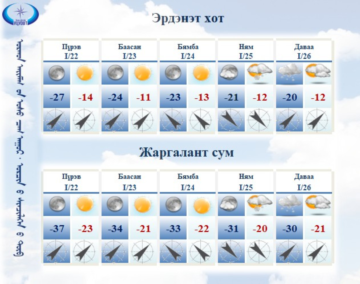 2026 оны 01 сарын 22-оос 01 сарын 27-ыг хүртэлх 5 хоногийн урьдчилсан мэдээ: