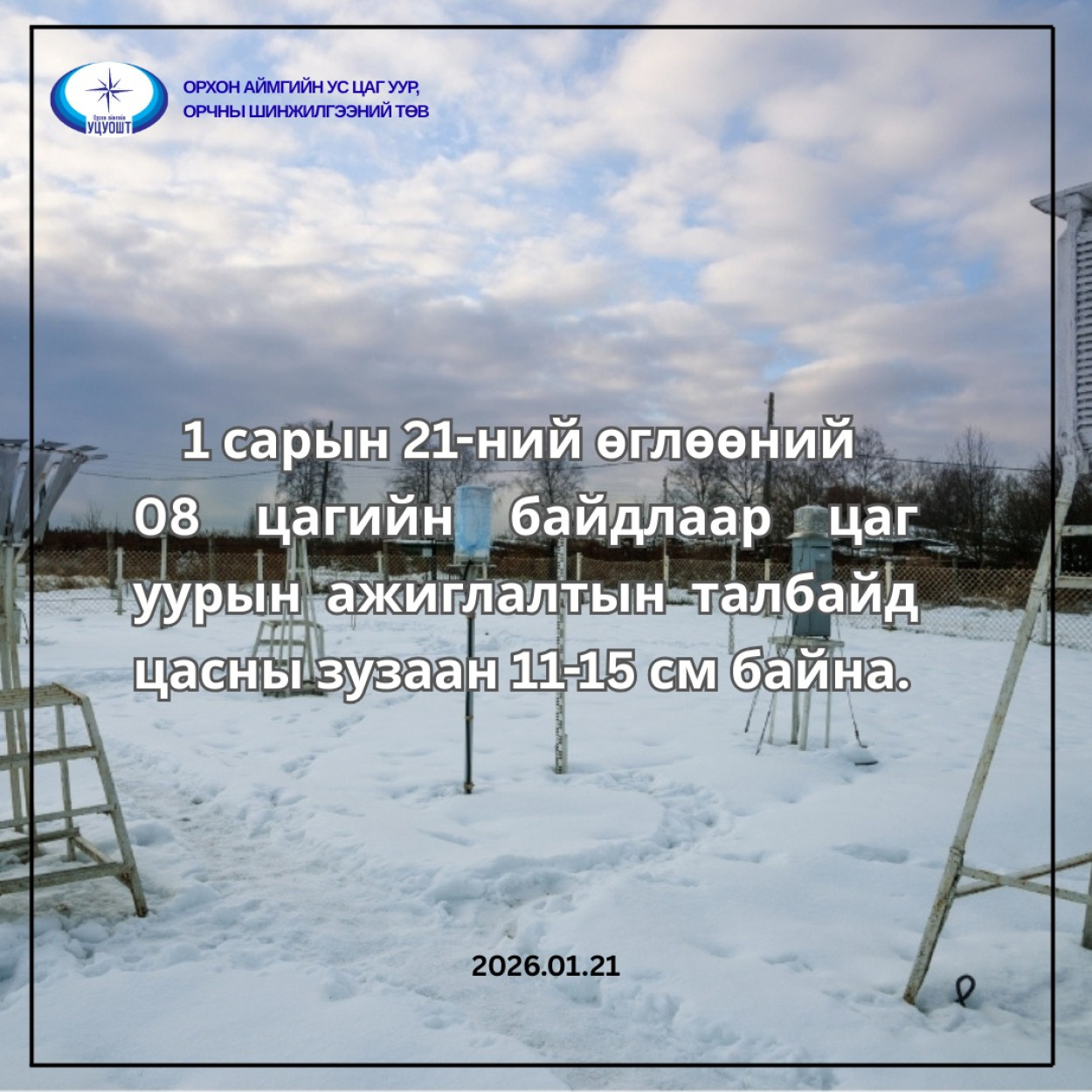 2026 оны 1 сарын 21-ний өглөөний 08 цагийн байдлаар цаг уурын ажиглалтын талбайд цасны зузаан 11-15 см байна
