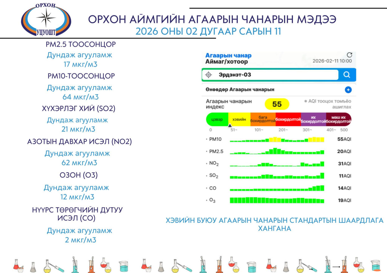 Орхон аймгийн агаарын чанарын мэдээ 2026.02.11