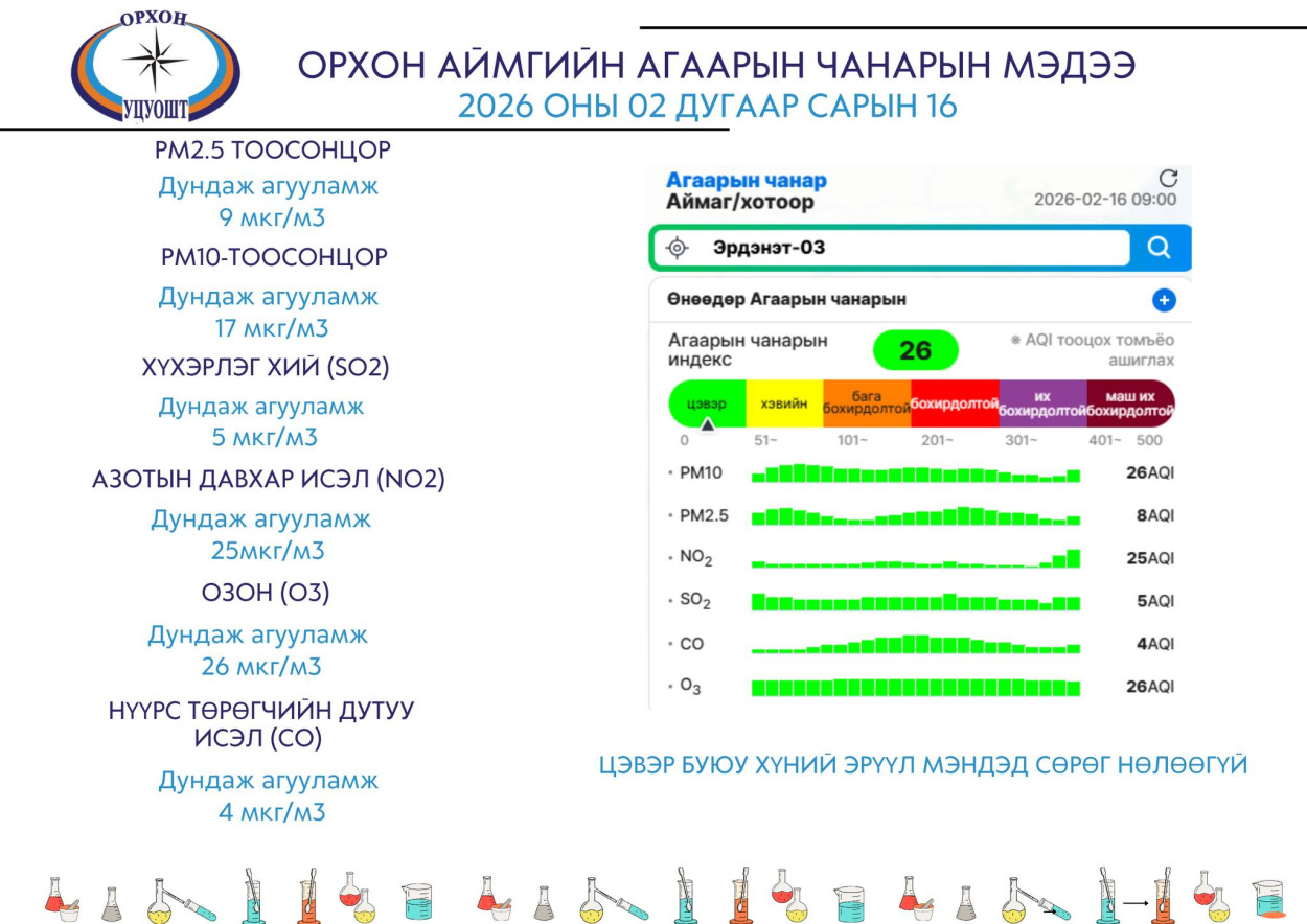 Орхон аймгийн агаарын чанарын мэдээ 2026.02.16