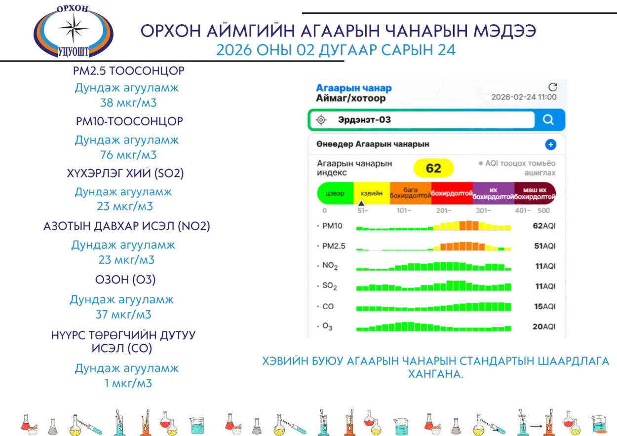 Орхон аймгийн агаарын чанарын мэдээ 2026.02.24